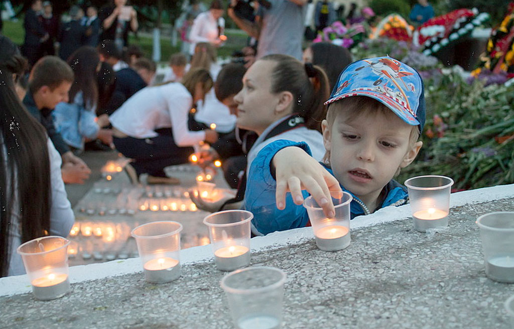 Akţiyada komratlılar hem musaafirlär memorialın eşiklerindä hem önündä 1418 mum yaktılar – o titsi cengin herbir günü için birär mum. Sora, anmak meropriyatiyanın programasına görä, ilkin gösterildi kısa bir film. Nedän sora da ortaya “Enseyiş Bayraa” çıkarıldı (Reystagın tepesinä koyulan bayraan kopiyası).