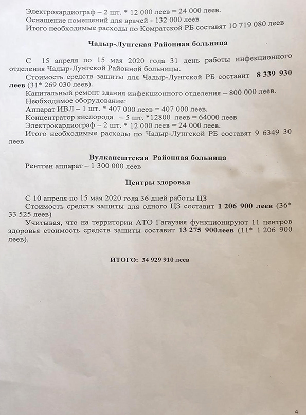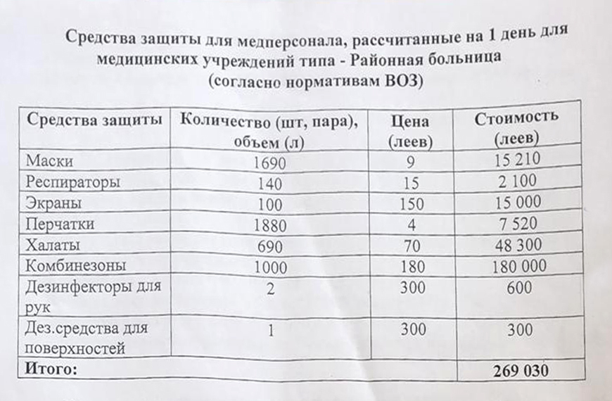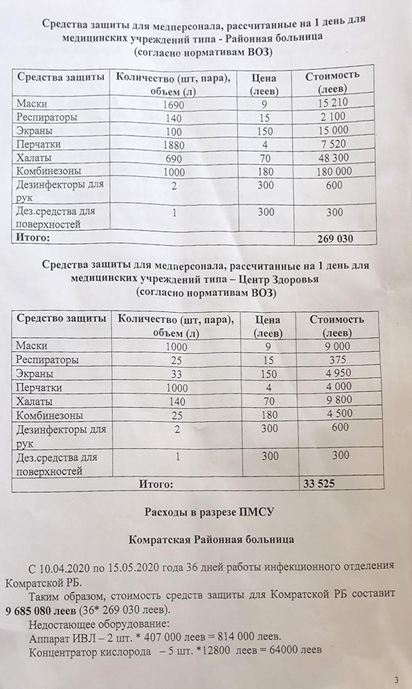 Örnek olarak Sergey ÇERNEY açıkladı bu smetanın kimi detallerini, angılarına görä, deycez “doktorlara ekrannar”ın birisi Moldovada 55 ley yapêr, bu smetada – 155 ley istener; ak ceerleri havalandırma aparatlar Türkiyedä 3 bin ABD doları yapêr, bu smetada – 20 bin Evro koyulu.