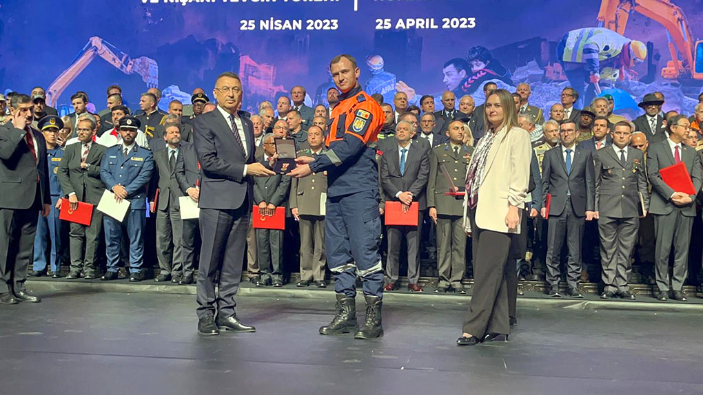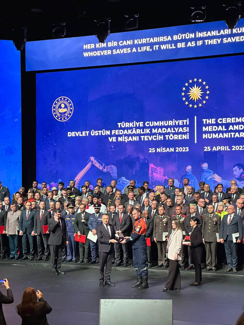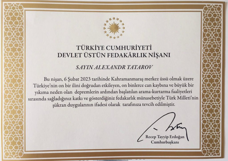 2023-cü yılın Çiçek ayın 25-dä Ankarada saygı gösterdilär hem “T.C. Üstün Fedakârlık medalisi”nän “T.C. Üstün Fedakârlık nışanı” verdilär kurtarıcı insannara, ani bu yıl Küçük ayın (fevral) 6-da Türkiyenin Kahramanmaraş bölgesindä merkezi olan er tepremesinin ardına, burayı gelip, aarama-kurtarma işlerindä pay aldılar.