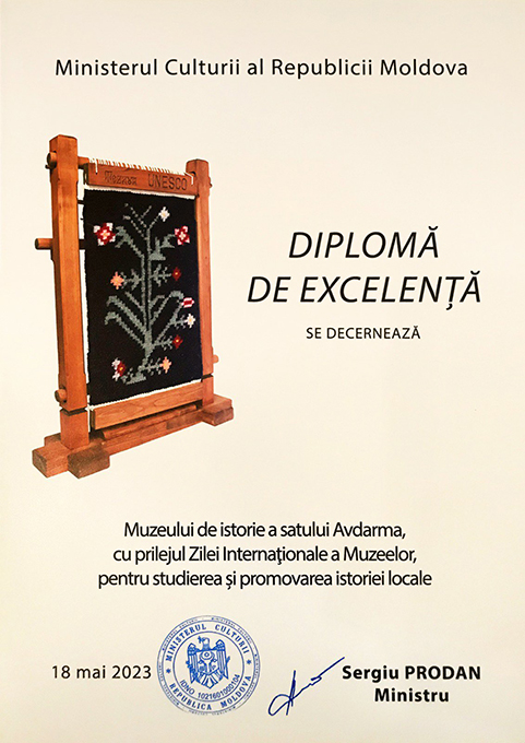 Hederlez ayın 18-dä bakılan halklararası Muzeylär Günündä, memleketin kultura varlıının bir payı olan Avdarma küüyün istoriyasını aaraştırması hem korunması için, Moldova Respublikasının kultura ministerlii ödülledi Avdarma küüyün istoriya muzeyini “Ekselensa Diploması”nnan.