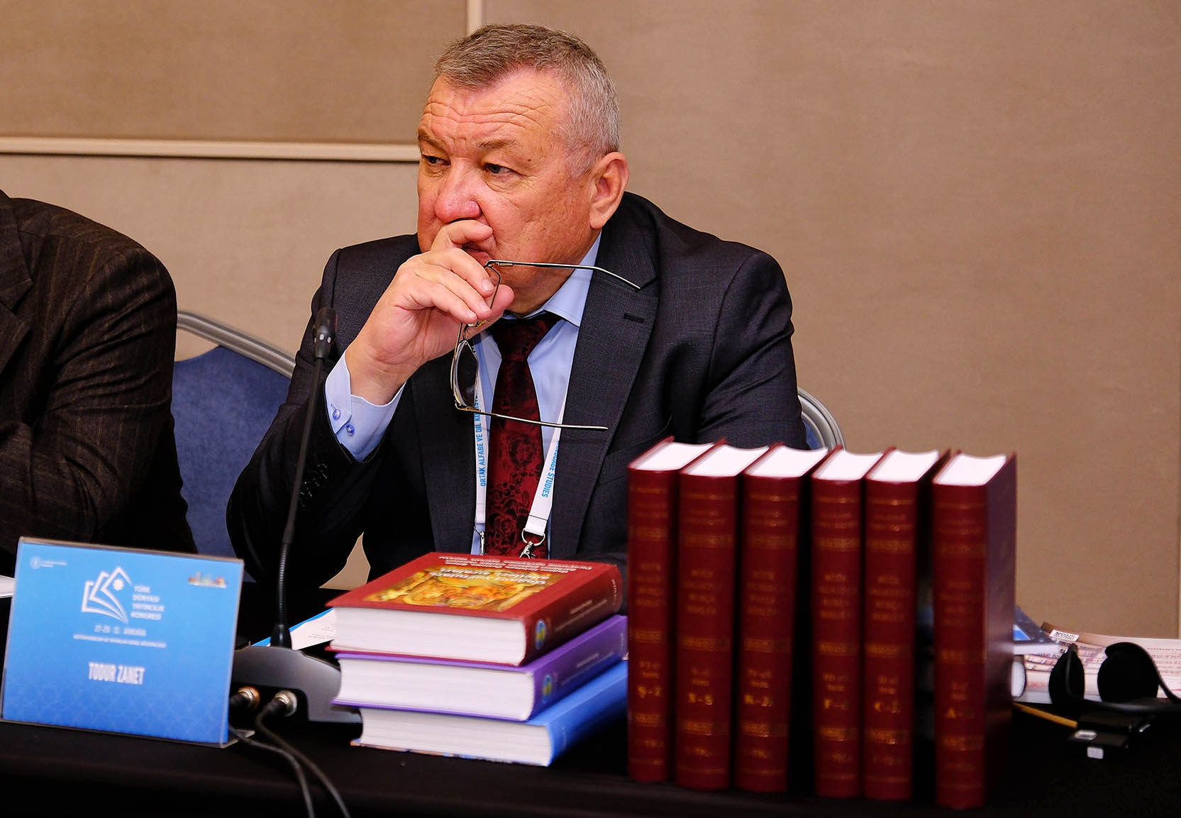 Buradan Kirgiziyadan sayın Yazıcılar Birlii başkanı lafetti. Bän ona bişey sölemää isteerim. Bän yollamıştım dokladımı burayı. Sansın Göktä Boba bana dedi, ani “konuyu al latinițayı!”