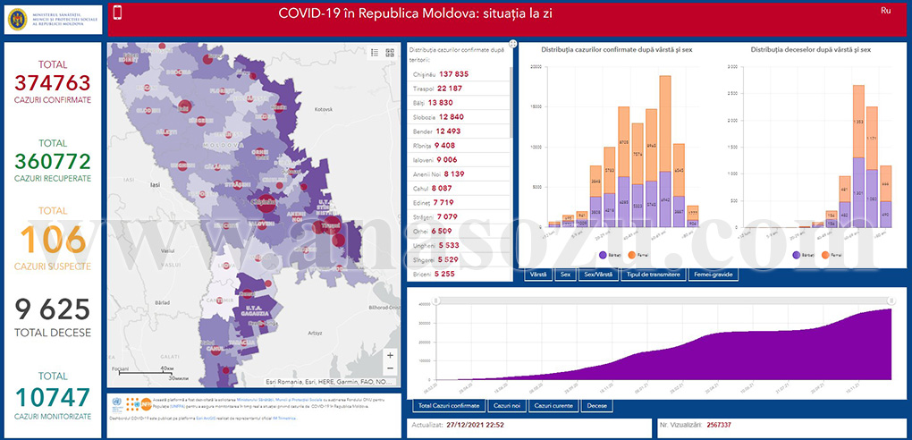 28.12.2021. Moldovada COVID-19 durumu bölä: ulaşannar – 374763; ölennär – 9 625; alışannar – 360772.