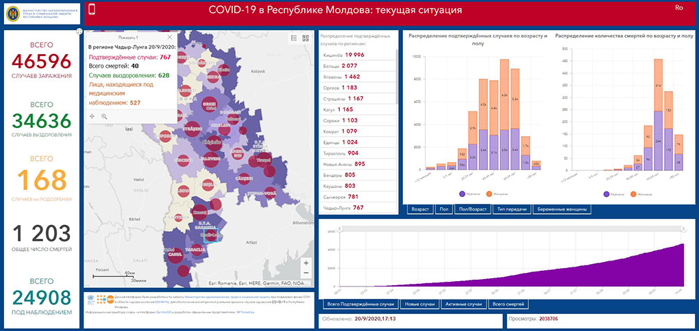 21.09.2020. Bu saatta Moldovada COVID-19 durumu bölä: ulaşannar – 46596; ölennär – 1203; alışannar – 34636.