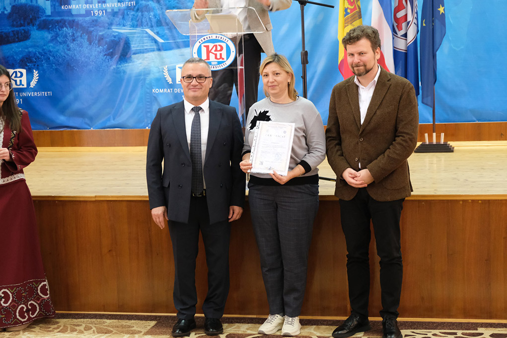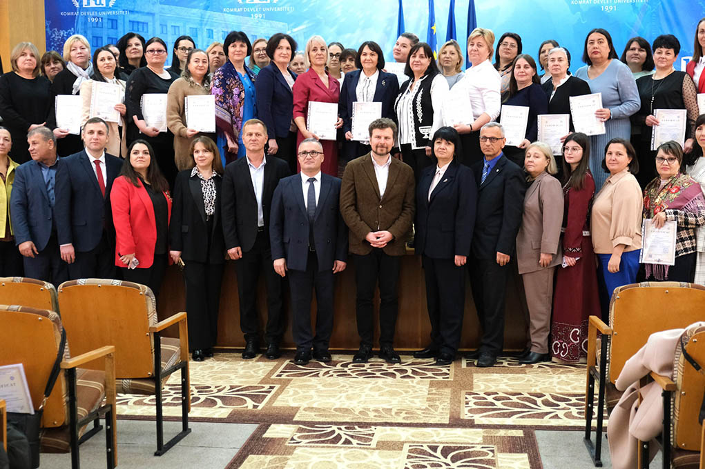 KDUnun büük zalında, 2025-ci yılın Harman ayı (avgust) – Canavar ayı (oktäbri) aylarında Gagauziyanın 51 uşak başçasından 61 gagauz dilindä üüredici-terbiedici insan için yapılan maasuz üüredicilik programasının başarılmasınnan ilgili bir kutlama sırası geçti. Sırada Moldova üüredicilik hem aaraştırma ministrusu Dan PERÇUN kutladı uşak başçalarında gagauz dilindä üüredici-terbiedicileri bu önemni işlän hem hepsinä, bu programayı başarıylan kazandıkları için, Sertifikatlar verdi. Buluşmada hem Sertifikar vermä sırasında pay aldılar Komrat Devlet Universitetın rektoru Sergey ZAHARİYA hem Gagauziya üüredicilik Upravleniyanın başı Natalya KRİSTEVA.