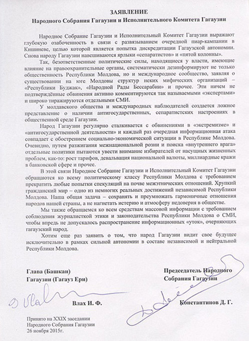 Kasım ayın 26-da Kişinevdan gagauzlara hem Gagauziyaya karşı yapılan yalancı açıklamalara karşı Gagauziya İspolkomun hem Halk Topluşun ortak Danışma yaptılar.