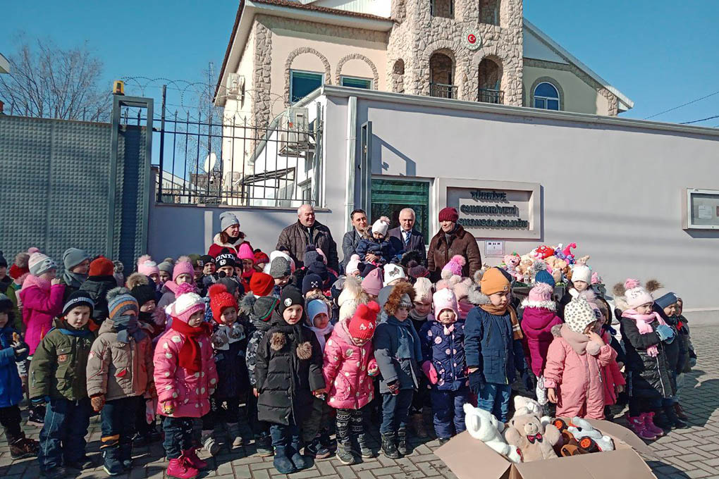 Türkiyedä er tepremesinindä cannarını kaybedän uşakları anmak için hem bu beladan kurtulan uşaklara deyni, Komrat 8-ci uşak başçanın uşakları hem terbiedicileri getirdilär Türkiye Gagauziya Komrat Başkonsulu çiçek hem oyuncak.