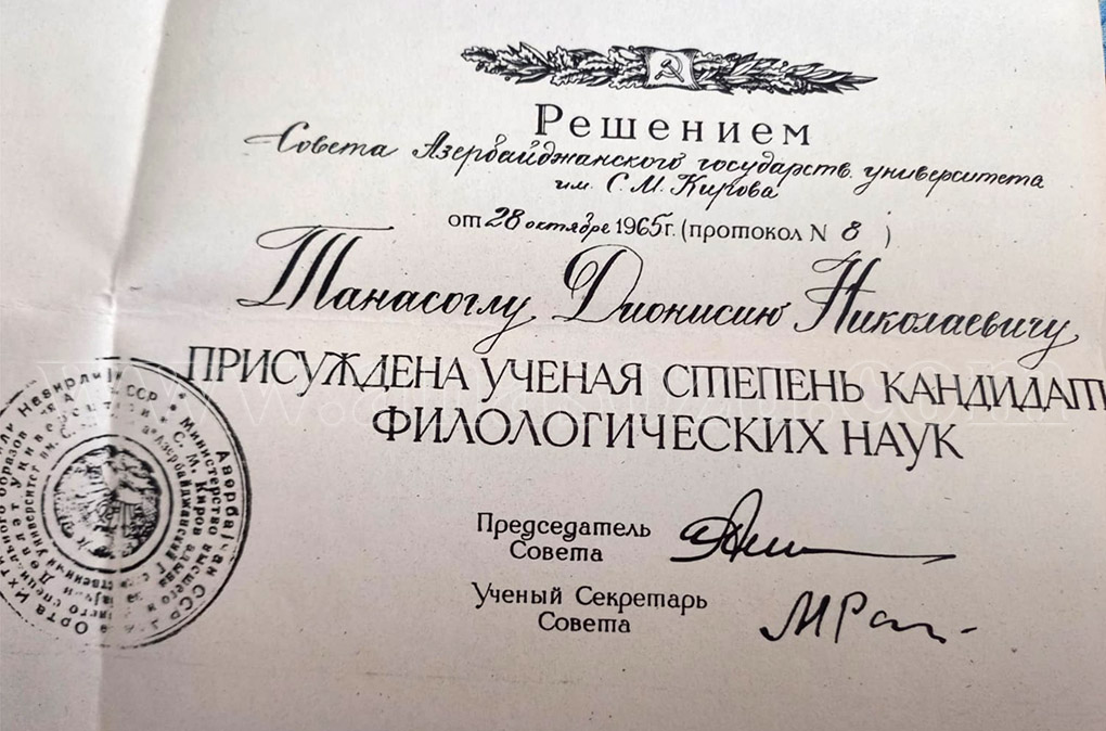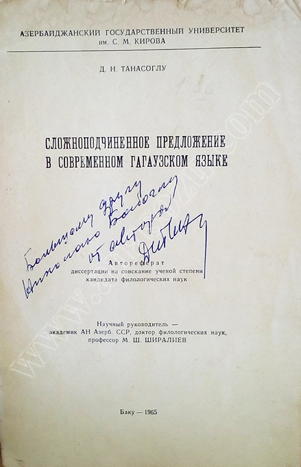 Dionis TANASOGLUnun bu çalışması, 300 ekzemplär olarak, tiparlandı Kişinevda hem Gagauziyanın merkez bibliotkasında var bu onun ekzeplärı. Bizä deyni pek paalı bu kiyat, çünkü disertațiyanın adında yazılı: «Большому другу Николаю Бабоглу от автора». 2009-cu yılda bu kiyat, başka literaturaylan bilä, Nikolay BABOGLUnun kızı Nina Nikolaevna tarafından bibliotekamıza verildi. Uzak 1965-ci yılda hazırlanan bu aaraştırma oldu Dionis TANASOGLUnun ilk büük başarısı, angısı seftä yapıldı gagauz dili uurunda. Taa ötää avtorda vardı taa çok önemni bilim, literatura hem incäzanaat çalışmaları, ani girdilär gagauz bilgiçliin hem kulturasının altın fonduna.