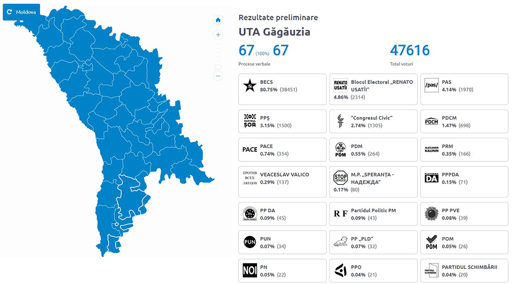 Herliim bakarsak Gagauziyada oylar nicä bölündü, göreriz, ani burası seçimcilär genä soțialistlerin hem komunistlerin yalannarını inandılar hem o yalannarın karannıı altında kaldırar. Bu iki partiyanın “MRSP+MRKP” (soțialistlär + komunistlär) elektoral bloku için Gagauziyada 80,75% oy verildi (38451 oy).