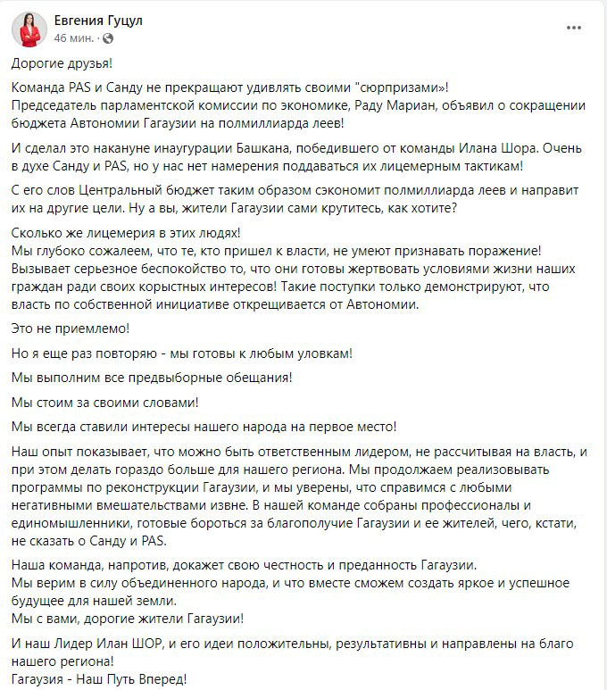 Gagauziyanın eni seçilän Başkankası Evgeniya GUȚUL bu Merkez kuvetlerin kararına karşı bir yazı yazdı, angısının özü budur: “Pek canımız acıyer, ani onnar, kim kuvedä geldi, kendilerinin enilmesini tanımêêrlar! Pek raatsız eder o, ani onnar kendi amellikleri için vatandaşlarımızın yaşamak durumunu kurban getirmää hazır. Onnarın bu yaptıkları gösterer, ani kuvet kendi istediindän Avtonomiyadan atılêr”.