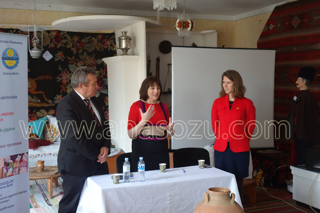 Prezintaţiya başlamadaan, prezentaţiyada pay alan Moldova Respublikasında ABD (Amerika Birleşik Devletleri) Büükelçisinin birinci yardımcısı Julie STUFFT hem ABD Büükelçiliin zaametçisi Zinaida WOLFİNGTON için Komrat muzeyinnän kısa bir tanışma yapıldı. Bu tanışmada urgular koyuldu gagauzların kulturasınnan, literaturasınnan hem istoriyasınnan ilgili eksponatlara.