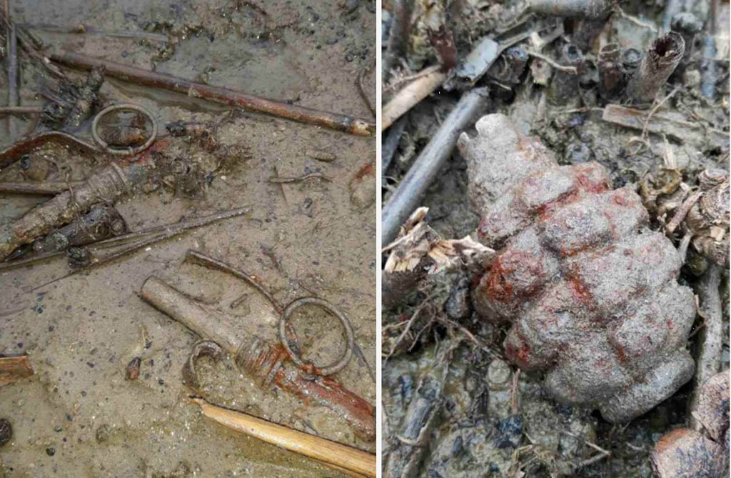 Suların gitmesi uzak 1990-cu yılların izlerini ortaya çıkardı – su içindän 5 granata F-1 hem 2 granata RGD-5 çıktı. Yannarında zapalları hem avtomat magazinnarı da var.
