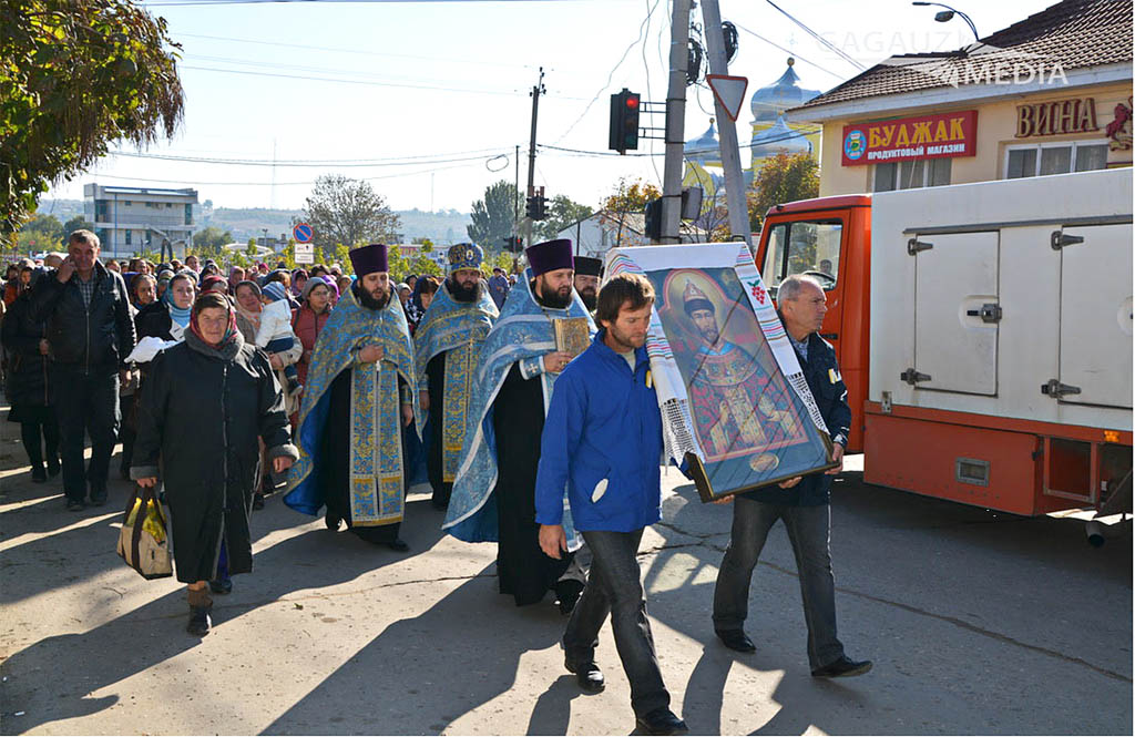 Canavar ayın (oktäbri) 14-dä, hristiannarın Allahıduuduran Ayozlu Ananın Örtüleri günü (Покрова Пресвятой Богородицы) büük din yortusunda, Komrat sokaklarında Kruça örüyüşü yapıldı.