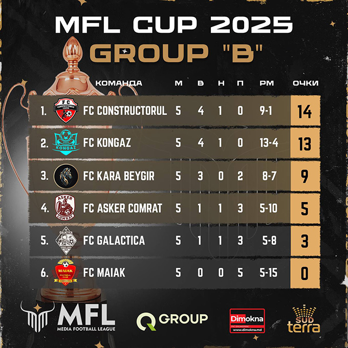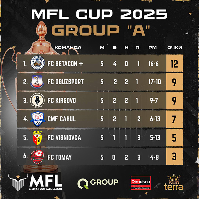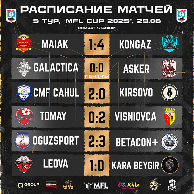 Kirez ayın (iyün) 29-da “MEDIA FOOTBALL LEAGUE CUP COMRAT” (“MFL CUP 2025”) futbol turnirın 5-ci turu matçlarınnan grupalarda oyunnar bitti. Şindi pley-of oyunnarı sırada.