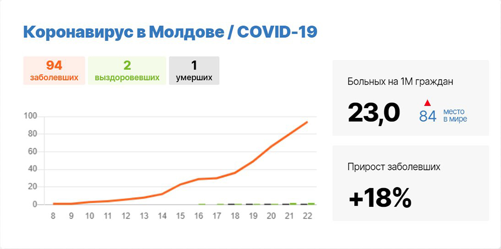 Pazar günü, Baba Marta ayın 22-dä avşamneyin yapılan açıklamakta Moldovanın saalıı, işi hem cümneyi koruma ministerlii bildirdi, ani 24 saatta COVİD-19-za ulaşan insannarın sayısı taa 14 kişiyä zeedelendi. Onnarın arasından evdä ulaşannar – 10 kişi, yabancılıktan gelennär – 4 kişi (İtaliyadan –1, Romıniyadan – 2, Ukraynadan – 1).
