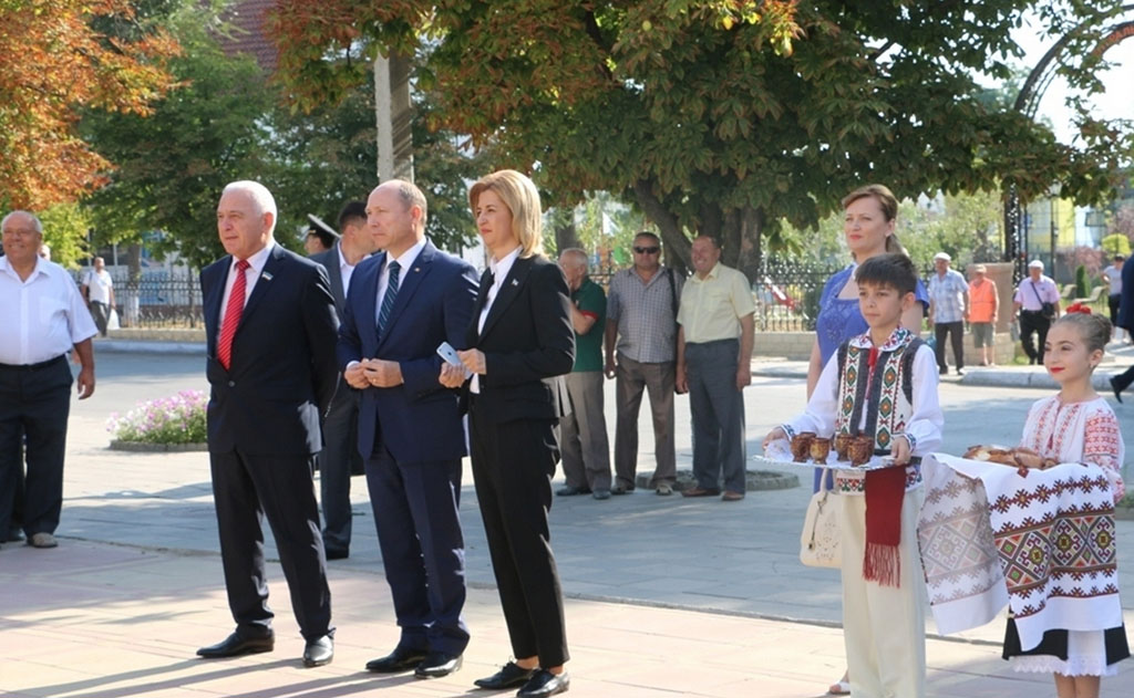 Moldovannın Premyer-ministrusunu Gagauziyanın başkannık binasının önündä tuz-ekmeklän karşladılar Gagauziyanın Başkanı İrina VLAH hem Gagauziya Halk Topluşun Başı Dimitriy KONSTANTİNOV. Nedän sora, üüsek musaafirä deyni, gagauz artistleri gagauz halk oyunnarını oynadılar.