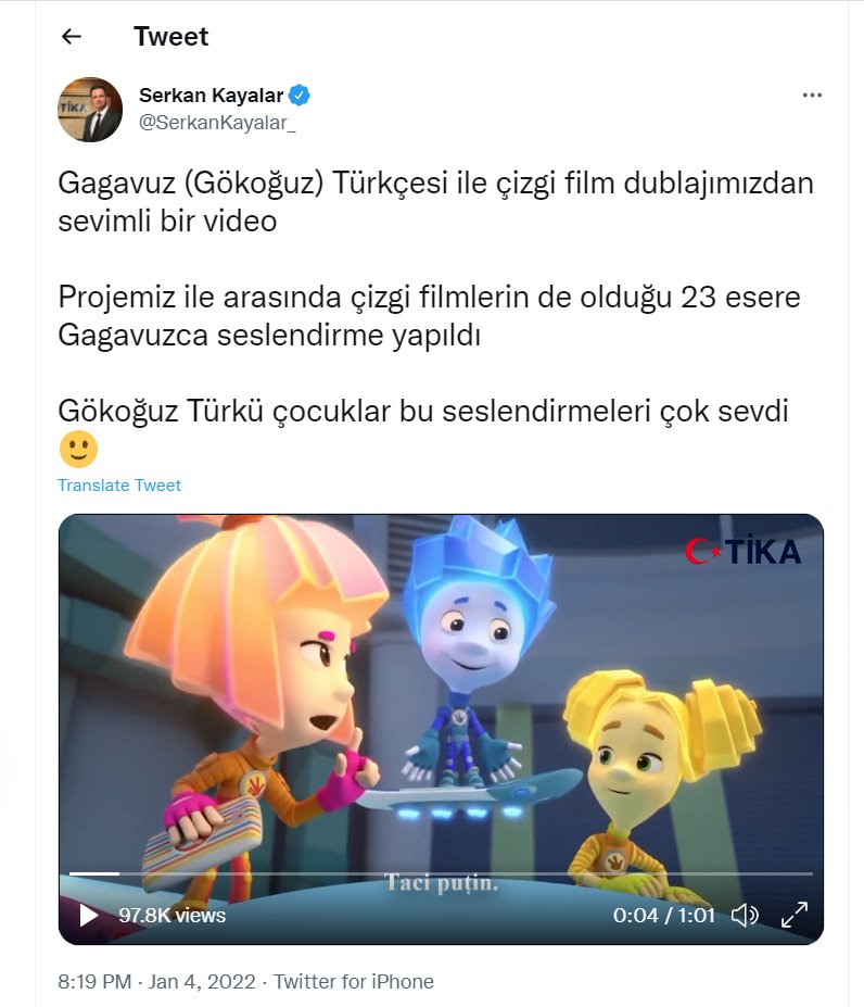 Türk İşbirlii hem Koordinațiya Agenstvosu (TİKA) Başkanı Serkan KAYALAR kendisinin twitindä bildirdi, ani TİKAnın Proektınnan dünnääyın 23 multiinä gagauzça dubläj başarıldı hem gagauz uşaklarına baaşlandı. Bu gözäl hem pek lääzımnı Proekt yapıldı o üzerä, ani rus dili ortamında bulunan gagauz uşaklarını hem büüklerini dä gagauz dilinä yaklaştırmaa hem, multiklär meraklıınnan, ana dillerinä döndürmää.