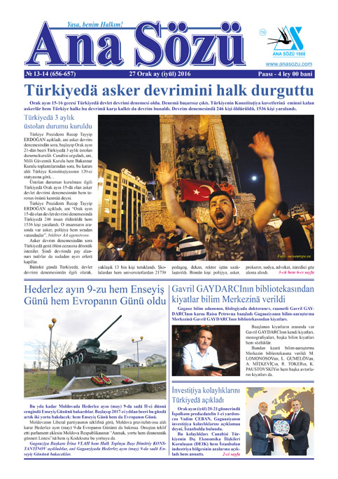 Orak ayın (iyül) 27-dä tipardan çıktı “Ana Sözü” gazetasının 2016-cı yılın Orak ayın (iyül) nomerı.