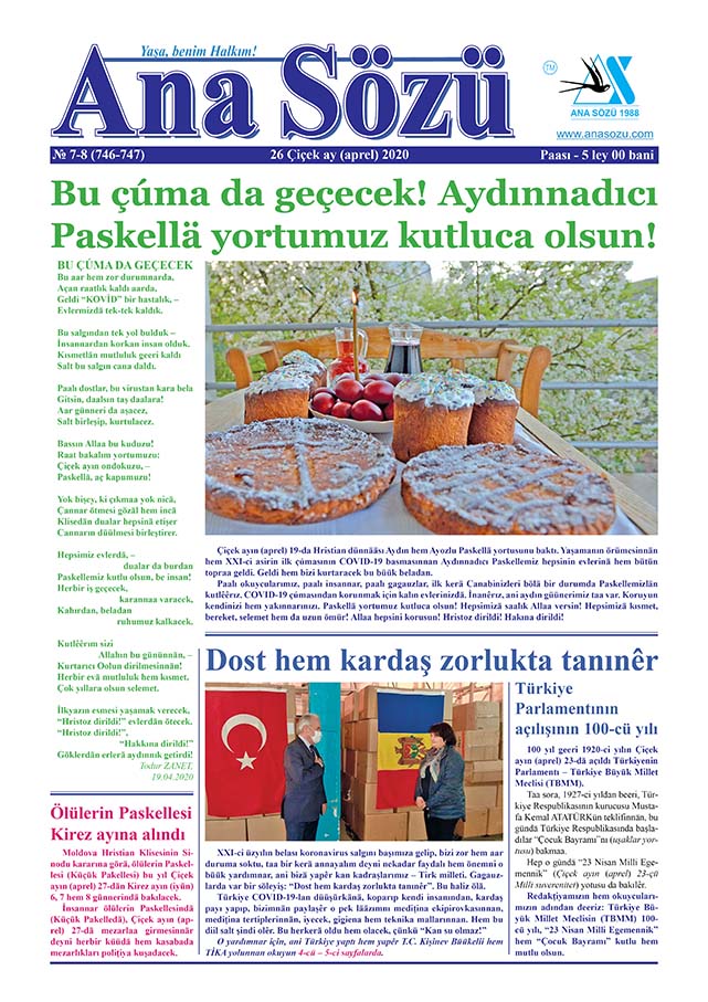 Çiçek ayın (aprel) 26-da tipardan çıktı “Ana Sözü” gazetasının 2020-ci yılın Çiçek ayın (aprel) nomerı. Nomerdä tiparlanan materiallar: “Bu çúma da geçecek! Aydınnadıcı Paskellä yortumuz kutluca olsun!”, “Türkiye Parlamentının açılışının 100-cü yılı”, “Dost hem kardaş zorlukta tanınêr”, “Ütülüdä küüyündä hem Çeşmä küüyündä COVID-19 karantin rejimı kuruldu”, “Mevlüt ÇAVUŞOĞLU: Bugün Yaptıklarımız Yarını Belirleyecek”, “Türkiedän Moldovaya medițina ekipirovkası yardımı geldi”, “TİKAdan Moldova İçişleri Ministerliinä medițina tertipleri yardımı”, “Balkannarın kara günü dostu – TİKA, yapılan saalık proektlarınnan, halkın yanında”, ““Ne mutlu bu insannarın canına, taa neredän, Turțiyadan, unutmamışlar bizi!”, “Nedän ilaçlamak? Hem ilaçlamak mı, gülmää almak mı osa deriyi soymak mı?”, “GHT deputatların “Gagauziyada COVID-19 pandemiyasınnan ilgili antikrizis sıraların Planı” İspolkomun umurunda da diil”, “Gündän günä Gagauziyada koronavirus için haberlär”, “II-ci dünnää cengi şindi da kurbannarını alêr” h.t.b.
