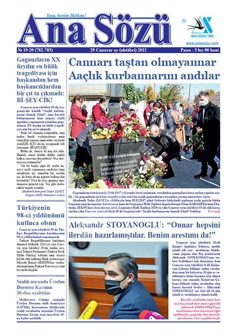 Canavar ayın (oktäbri) 29-da tipardan çıktı “Ana Sözü” gazetasının 2021-ci Canavar ayın (oktäbri) nomerı. Nomerdä tiparlanan materiallar: “Gagauzların XX üzyılın en büük tragediyası için başkandan hem başkancıklardan bir çıt ta çıkmadı: Bİ-ŞEY-CİK!”, “Cannarı taştan olmayannar Aaçlık kurbannarını andılar”, “Türkiyenin 98-ci yıldönümü kutluca olsun”, “Aleksandr STOYANOGLU: “Onnar hepsini ilerdän hazırlamıştılar. Benim arestımı da!””, “Aleksandr STOYANOGLU tutuklandıynan: “Bu – memlektin prezidentı tarafından kinnik””, “Aleksandr STOYANOGLU: “Bu iş politika harakterını taşıyan bir iştir””, “Aleksandr STOYANOGLUnun üstünä ataka – bütün Gagauziya insannarı üstünä atakadır!”, “Aleksandr STOYANOGLUnun serbest brakılması için mitinglar hem protestlar geçer – Gagauziya başkanı susêr!”, “Fadey NAGAÇEVSKİY: Stoyanogluyu lääzım diil salt serbest brakmaa, ama, onu iş erinä döndürüp, ona reabilitațiya yapmaa”, “2023-cü yılda Komrat BDTnın kultura baş kasabası olacek”, “Köşä ardında polițiyaylan buluşmaya hazır olun!”, “TİKA Başkan yardımcısı Dr. Mahmut ÇEVİKlän gagauz proektları lafedildi”, “Moldova Rusiyaylan gaz oyuncaa oynêêr, insannar sa tezeklän yısınmaya geçerlär”, “1946-1947 yıllarda Aaçlık – milletimizin tragediyası”, “Çeşmä küüyündä 1946-1947 yıllarda Aaçlık kurbannarını anmak sırası”, “Avdarma küüyündä 2018-dän beeri Aaçlık kurbannarını ofițial anêrlar” h.t.b.