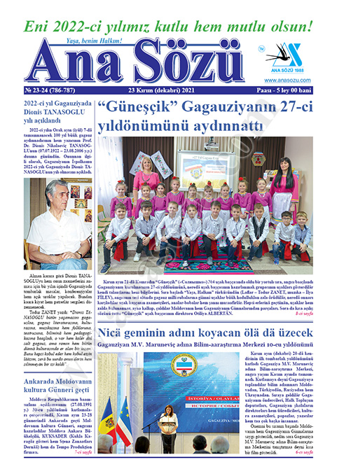 ırım ayın (dekabri) 23-dä tipardan çıktı “Ana Sözü” gazetasının 2021-ci Kırım ayın (dekabri) nomerı. Nomerdä tiparlanan materiallar: ““Güneşçik” Gagauziyanın 27-ci yıldönümünü aydınnattı”, “2022-ci yıl Gagauziyada Dionis TANASOGLU yılı açıklandı”, “Ankarada Moldovanın kultura Günneri geçti”, “Nicä geminin adını koyacan ölä dä üzecek (Gagauziyan M.V. Maruneviç adına Bilim-aaraştırma Merkezi 10-cu yıldönümü)”, “Aleksandr STOYANOGLU serbest brakıldı, ama onun serbestlik hakkı ezildi”, “Venețiya komisiyası dedi: Moldova Baş prokurorun işini kantarlama proțedurasını enidän incelesin”, ““Gülüntü deputatlar” tragikomediya spektaklisinin artık 9-cu perdesi cumaaya!”, “Gagauzlar TİKA Başkan Yardımcısı Dr. Mahmut ÇEVİKlän lafedildi”, “Komrat gemodializ bölümünä Türkiyedän yardım”, “Kongaz Todur ZANET adına teoretik lițeyin 180-ci yıldönümü kutluca olsun!”, “Raametli resimciykanın Olga UNGURÄNUnun anılmasına sergi”, ““Kiyatlan aydınaa” Türkiye Bartın kiyat pazarı”, “Aydar küüyün gimnaziyası 180 yılını kutladı” h.t.b.