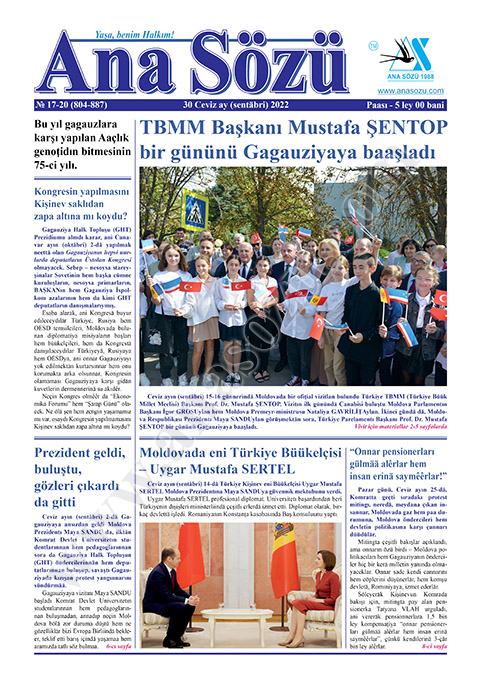 Ceviz ayın (sentäbri) 30-da tipardan çıktı “Ana Sözü” gazetasının 2022-ci Ceviz ayın (sentäbri) nomerı. Nomerdä tiparlanan materiallar: “Bu yıl gagauzlara karşı yapılan Aaçlık genoțidın bitmesinin 75-ci yılı”, “TBMM Başkanı Mustafa ŞENTOP bir gününü Gagauziyaya baaşladı”, “Moldovada eni Türkiye Büükelçisi – Uygar Mustafa SERTEL”, “Prezident geldi, buluştu, gözleri çıkardı da gitti”, “Moldovada eni Türkiye Büükelçisi – Uygar Mustafa SERTEL”, “Onnar pensionerları gülmää alêrlar hem insan erinä saymêêrlar!”, “Aya Mariya gününä karşı “Aya Mariya” dünneyi gördü”, “BUTAFORİYA: dermen daaldı – göz boyacılar 800 bin leylik işi, göz kararına, 30 bin leyä yapmışlar”, ““23. Suçıktı Şiir Avşamnarı” büük can sıcaklıınnan geçti”, “TİKA Başkan Yardımcısı Dr. Mahmut ÇEVİK: “Balkannarda 100-ä yakın material varlıını ayaa kaldırdık””, “Başkannık orkestrası “II-ci Bursa halklararası duhovoy ansamblilerin Festivali”nä katıldı” h.t.b.