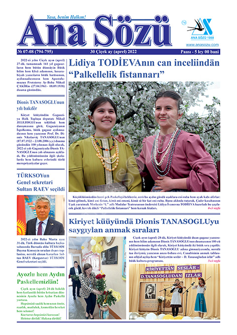 Çiçek ayın (aprel) 30-da tipardan çıktı “Ana Sözü” gazetasının 2022-ci Çiçek ayın (aprel) nomerı. Nomerdä tiparlanan materiallar: “Bücet için Başkankanın vetosunu geçip, İspolkomun tamahlıını biraz aazalttılar”, “Lidiya TODİEVAnın can inceliindän “Palkellelik fistannarı””, “TÜRKSOYun Genel sekretari Sultan RAEV seçildi”, “Kiriyet küüyündä Dionis TANASOGLUyu saygıylan anmak sıraları”, “Başkanka uşaklardan 600 saat vakıt çaldı!”, “Hazır, “Georgievskaya” denilän şiridin üstünä Moldovada nestettilär”, “Gagauziyada “Georgievskaya” denilän şirit kuvettä kalêr, ama amasının aması var…”, “Bütün latin alfavitini zapa altına mı koyaceklar acaba?”, “TİKA Uzbekistanda Türkologiya Aaraştırma İnstitutunu kurdu”, “TİKAdan Moldovaya 2022-ci yılın Ramazanın yardımnarı”, “Caltayda yazıcıylan buluşmak hem “Altın ellär” sergisi”, “Taa ilktän iki Grand-Pri, birinci erlär hem premiyalar” h.t.b.