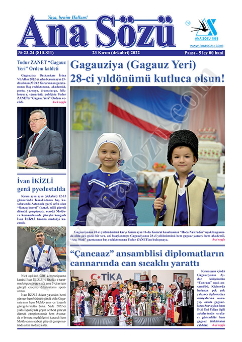 Kırım ayın (dekabri) 23-dä tipardan çıktı “Ana Sözü” gazetasının 2022-ci Kırım ayın (dekabri) nomerı. Nomerdä tiparlanan materiallar: “Gagauziya (Gagauz Yeri) 28-ci yıldönümü kutluca olsun!”, “Todur ZANET “Gagauz Yeri” Ordenı kableti”, “İvan İKİZLİ genä pyedestalda”, ““Çancaaz” ansamblisi diplomatların cannarında can sıcaklıı yarattı”, “Dışişleri ministruları İstanbulda buluştular”, “Moldova ministularına T.C. Kişinev Büükelçisinin saygı vizitı”, “Buluşmak zamanında ikili işbirlii perspektivaları konuşuldu. Ayırıca, Moldova tarafı şükür etti o yardımnar için, ani Kovid salgını zamanında Türkiye tarafından Moldovaya yapıldı hem o proektlar için, ani Moldovada çiftçilik hem korunmak uurunda yapılêr”, “TİKA Balkannarda 5 bindän zeedä proekt ömürä geçirdi”, “Bu Seçim kodeksı Gagauziyayının yok edilmesinä de-yüre yolunu açtı”, ““Aya Mariya” kiyadın avtorunnan hem resimcisinnän buluşma”, “Kıymetli insannara Gagauziya ödülleri verildi”, “Avdarma küüyün istoriya muzeyindä “Can acısı” kiyadına prezentațiya”, “Mihail ÇAKİR adına biblioteka 30-cu yıldönümünü kutladı”, “65-ci yıldönümünä Mihail ARABACInın resim sergisi”, “Gagauziyanın 28-ci yıldönümünä karşı “Hoca Nastradin” uşak başçasında gözelin gözelisi olan sıra” h.t.b.