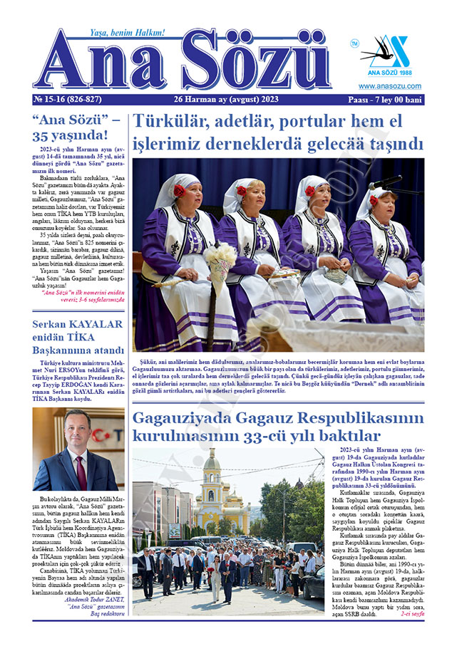 Harman ay (avgust) 26-da tipardan çıktı “Ana Sözü” gazetasının 2023-ci Harman ay (avgust) nomerı. Nomerdä tiparlanan materiallar: ““Ana Sözü” – 35 yaşında!”, “Serkan KAYALAR enidän TİKA Başkannıına atandı”, “Gagauziyada Gagauz Respublikasının kurulmasının 33-cü yılı baktılar”, “Türkülär, adetlär, portular hem el işlerimiz derneklerdä gelecää taşındı”, “Halk Topluşu diriner, Başkanka verilmeyä hazır”, “Ölmä eşeciim!.. Gagauz dilini üüreneceklär mi osa Halk Topluşun ensesini mi kıvradaceklar?”, “Moldovanın “Separatizma nacaa” Dimitriy KONSTANTİNOVun ensä kökündä”, “Mihail VLAH Başkankanın cümne danışmanı koyuldu”, “Moldovan hem bulgar rayonnarından şorcuların Gagauziyaylan ne işleri var?”, “Komratta “Komur-At” koşuları oldu”, ““Umutluk” futbol klubu Molldovanın çift çempionu oldu”, “GRTdan kutlama”h.t.b.