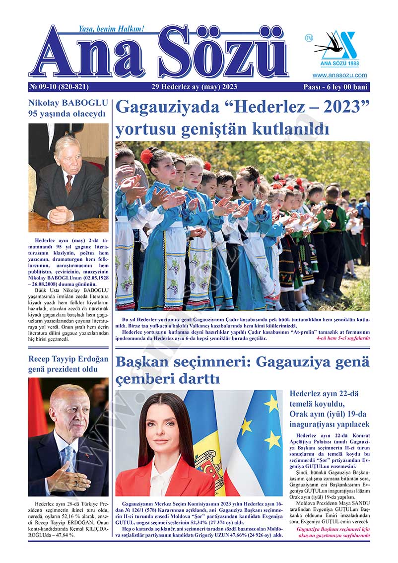 Hederlez ayın (may) 29-da tipardan çıktı “Ana Sözü” gazetasının 2023-cü Hederlez ay (may) nomerı. Nomerdä tiparlanan materiallar: “Nikolay BABOGLU 95 yaşında olaceydı”, “Recep Tayyip Erdoğan genä prezident oldu”, “Gagauziyada “Hederlez – 2023” yortusu geniştän kutlanıldı”, “Başkan seçimneri: Gagauziya genä çemberi darttı”, “Para hem partiyalar büük iş: Gagauziya başkan seçimnerin birinci turun sonuçları”, “Genä, rus dilinnän başımıza urup, erimizi gösterdilär!”, “Gagauziyayı diz aşırı kırêrlar: insannar hem Halk Topluşu “Eni Başkanımız var!” dedilär”, “Halk Topluşun, İspolkomun hem primarlar topluluunun AÇIKLAMASI”, “Herbir uurda deputatların Kongresi oldu”, “Bucak küüyü gimnaziyasında Gagauz dilinä saygı”, “Avdarma muzeyinä “Ekselensa Diploması””, “Biricii unudulmadı, bişey unudulmadı” h.t.b.