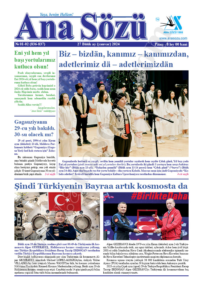Büük ayın (yanvar) 27-dä tipardan çıktı “Ana Sözü” gazetasının 2024-cü yılın Büük ayın (yanvar)  nomerı. Nomerdä tiparlanan materiallar: “Biz – bizdän, kanımız – kanımızdan, adetlerimiz dä – adetlerimizdän”, “Şindi Türkiyenin Bayraa artık kosmosta da”, “Kestilär, keserlär hem kececeklär dä…”, “Evgeniya GUȚUL hem Dimitriy KONSTANTİNOV diplomatiya misiyalarına Gagauziyaya deyni para yardımı için danıştılar”, ““Gagauziya (Gagauz Yeri) özel hak statusu için” Zakonun 29-cu yılı bakıldı”, “Çok uşaklı aylelerä “Kızıl ay” yardımı”, “Çok uşaklı aylelerä “Kızıl ay” yardımı”, “Bilim Merkezi 2023 çalışma yılını kapattı hem ödüllerini verdi”, “Aydar küüyünä TİKAdan güneş panelleri”, “Çadırdakı M. ÇAKİR lițeyindä Tehnoklas kuruldu”, “Türkiyedä parasız üürenmeyä buyuyurun!”, “Poyraz Makedoniyada Türkçä Üürenmäk Günü bakıldı”, “Dimitri MAVRODİ lițeyi – “Okuyêrız gagauz avtorların şiirlerini””, ““Can pazarında can pazarlıı” kiyadına tanıtma sırası”, “I-ci “ENİ TÜRKÜ” yarışmasının Grand-Pri ödülü Yulya ARANAUTta”  h.t.b.