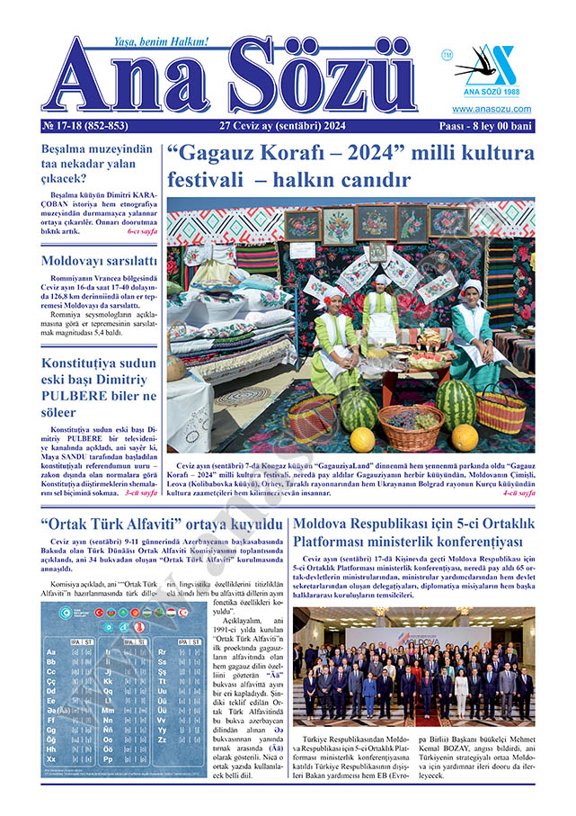 Ceviz ayın (sentäbri) 27-dä tipardan çıktı “Ana Sözü” gazetasının 2024-cü yılın Ceviz ayın (sentäbri) nomerı. Nomerdä tiparlanan materiallar: “Beşalma muzeyindän taa nekadar yalan çıkacek?”, ““Gagauz Korafı – 2024” milli kultura festivali – halkın canıdır”, ““Ortak Türk Alfaviti” ortaya kuyuldu”, “Moldova Respublikası için 5-ci Ortaklık Platforması ministerlik konferențiyası”, “Kişinev Devlet Universitetına TİKAdan Cezeri Lab proektı”, “Evropada hem Moldovada “Bóris” țıklonu can aldı hem üzlärcä milion evro mal zararı getirdi”, “Romıniyada sel kıyametindän zarar görennerä Türkiye, TİKA yolunnan, yardım elini uzattı”, “Prezidentlää seçim kompaniyası Ceviz ayın 20-dän beeri başladı”, “Referendumda sade 15 politika partiyası, akıntısı, bloku hem asoțiațiyası pay alacek”, “Konstituțiya sudun eski başı Dimitriy PULBERE biler ne söleer”, ““Mamucuumnan kol-kola” kiyadın prezentațiyası”, “Avrasya Yazarlar Birlii Dernää (AYB) Önetim Soveti 25.08.2024 gündän kararı”, “Evropada artık ikonaları kurşuna urêrlar”, ““OGUZ-KWON” klubunda 20 medali h.t.b.