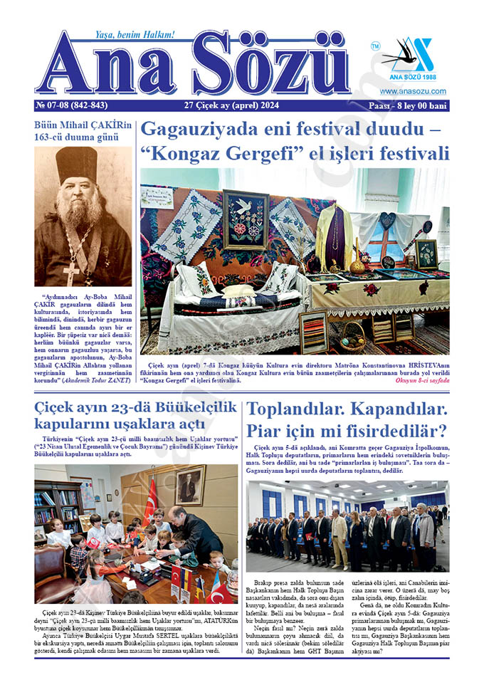 Çiçek ayın (aprel) 30-da tipardan çıktı “Ana Sözü” gazetasının 2024-cü yılın Çiçek ayın (aprel) nomerı. Nomerdä tiparlanan materiallar: “Büün Mihail ÇAKİRin 163-cü duuma günü”, “Gagauziyada eni festival duudu – “Kongaz Gergefi” el işleri festivali”, “Çiçek ayın 23-dä Büükelçilik kapularını uşaklara açtı”, “Toplandılar. Kapandılar. Piar için mi fisirdedilär?”, “Premyer Dorin REÇANın Kongazda iki türlü buluşması”, “Kongazlılarlan buluşma olmadı, ama LÊPın açılışı yapıldı”, “Maya SANDU KDUda: polițiya sinciri, primarlara saklı sözleri, KDU sturdentleri hem KDU binasında EB bayraa”, “Moldovanın protezlik, ortopediya hem reabilitațiya merkezinä olacek”, “TİKAdan taa bir saalık proektı”, “Parlamentta “Gagauz yazısı hem dili Günü” sırası geçti”, ““Can pazarında can pazarlıı” kiyadına Kongaz Todur Zanet adına lițeydä prezentațiya”, “Ankaradan “Tiyatro Tempo” Gagauziyada büük gastrolisi”, “REPLİKA: Ufak yalan damnalarınan büük yalan sellerini boşandırêrlar”, “REPLİKA: Yalannar duumasın deyni, teknik yannışlıkları doorutmaa lääzım!”, “Gagauzların Can hem Ruh zenginniin korunması”, “Kıpçakta “Uşakların masal dünnääsı. Copiii și lumea teatrului”” h.t.b.