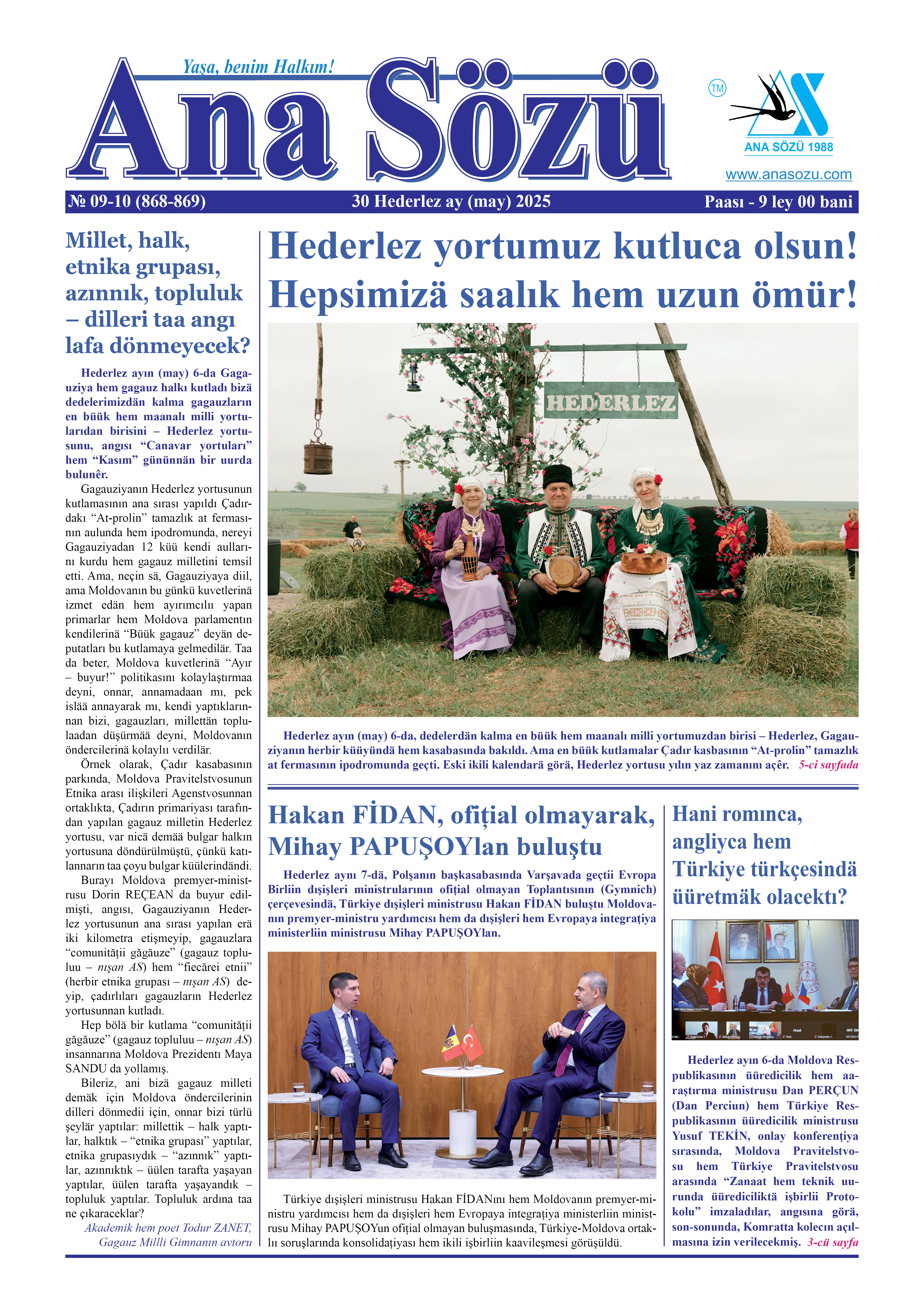 Hederlez ayın (may) 30-da tipardan çıktı “Ana Sözü” gazetasının 2025-ci yılın Hederlez ayın (may) nomerı. Nomerdä tiparlanan materiallar: “Millet, halk, etnika grupası, azınnık, topluluk – dilleri taa angı lafa dönmeyecek?”, “Hederlez yortumuz kutluca olsun!”, “2025 yıl Türkiyedä “Aylä Yılı” olarak bildirildi”, “Hakan FİDAN, ofițial olmayarak, Mihay PAPUŞOYlan buluştu”, “Hani romınca, angliyca hem Türkiye türkçesindä üüretmäk olacektı?”, “Şah hem mat: dildä bizä köstek, bulgarlara sa yol”, “Evgeniya GUȚUL: “Bu jurudika dooruluu diil – bu represiyalar!””, “Rusiya hem Ukrayna arasında barış annaşması için buluştular”, “Moldova karabinerleri hem Türkiye jandarma arasında işbirlii”, “Gagauziyada binnärcä insan Enseyiş Günün 80 yıldönümünü kutladı”, “TİKAdan “Moldovada Ana hem Uşak Saalıına yardım etmäk üüredicilik Programa”sı”, “TİKAdan “KOHA biblioteka sisteması”na integrațiya kursaları”, “6-cı Türk Dünnäsı Ozannar Şöleni hem Ali Ekber Çiçek Anısına Aşık Literaturası Çalıştayı”, “Her pazar futbol, beki dä, her pazar gollan gol!”, “Gagauziya da “ATATÜRKü anma, Gençlik hem sport Günü” yortusunu baktı”, “Avdarma muzeyinä “Büük ödül””, “Kongaz lițeyindän üürencilär Halklararası MEB Robot yarışmasında” h.t.b.