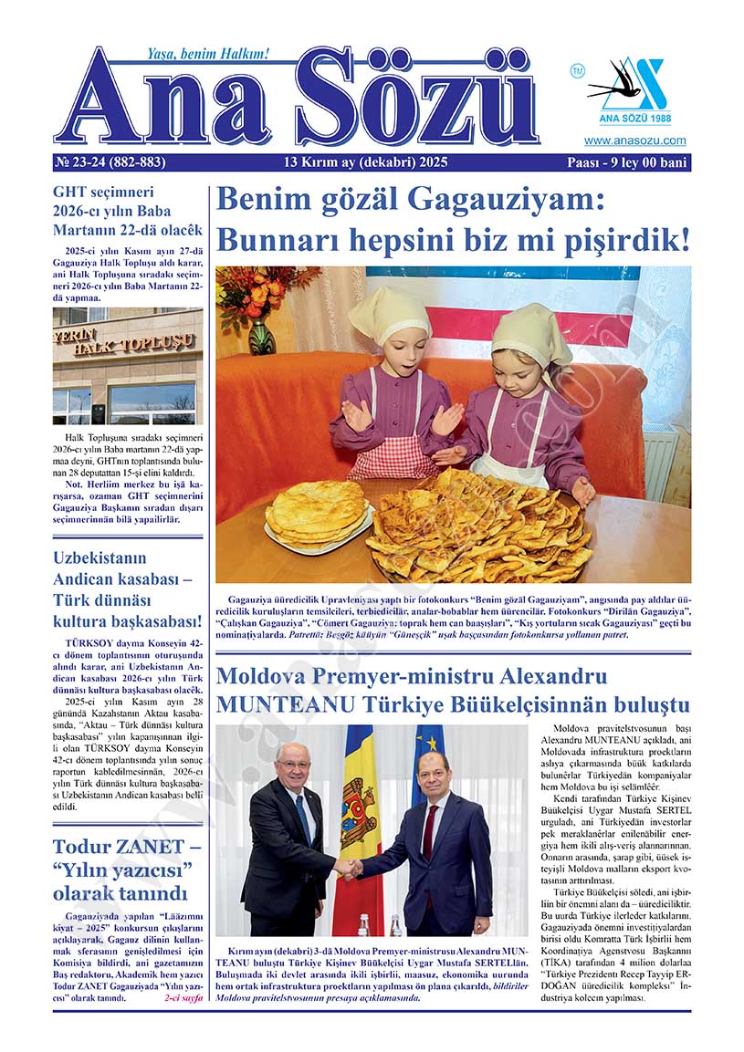 Kırım ayın (dekabri) 13-dä tipardan çıktı “Ana Sözü” gazetasının 2025-ci yılın Kırım ayın (dekabri) nomerı. Nomerdä tiparlanan materiallar: “GHT seçimneri 2026-cı yılın Baba Martanın 22-dä olacêk”, “Benim gözäl Gagauziyam: Bunnarı hepsini biz mi pişirdik!”, “Moldova Premyer-ministru Alexandru MUNTEANU Türkiye Büükelçisinnän buluştu”, “Todur ZANET – “Yılın yazıcısı” olarak tanındı”, “Dan PERÇUN Gagauziyaya bir vizit yaptı”, “Bekleeriz Taraklı bulgar Universitetında da bir “Gagauz dili hem kulturası” merkezi açılsın”, “Salonik kasabasında ATATÜRKün duuduu ev enidän açıldı”, “Türkiye hem Moldova arasında güvennik işbirlii”, “Uşak saalıını korumasını kaavileştirilän TİKA proektı”, “Candan-ürektän şükür ederiz TİKAya bölä gözäl bir iş için”, “Üüredicilik proțeslarını kullanmakta efektli yaklaşımnar”, “Nikolay FRANGU genä Evropa çempionu oldu”, “Moldova Respublikasının İstanbul Başkonsulluunda biblioteka kuruldu”, “Respublikadakı akıl oyunnarı gümüş ödülünün saabileri oldular”, “Gagauzlarda aaçlık için KDUda romınca, rusça hem angliyca sergi”, “Bu yıl III-cü “İncäzanaat sızıntısı” akıl kvest-oyunu yapıldı”, “Yaşamak – o bir bütün sıra, Yaşadıkça, hergün sän yaşa!” h.t.b.