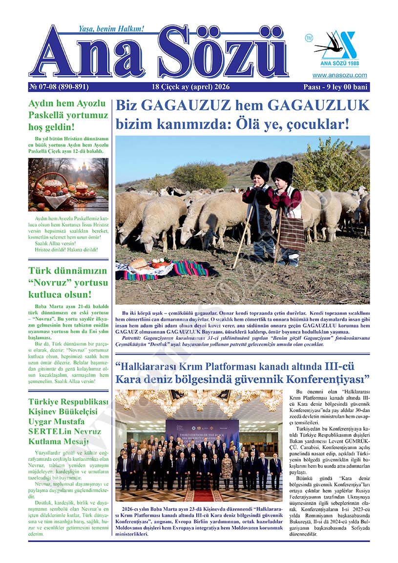 Çiçek ayın (aprel) 18-dä tipardan çıktı “Ana Sözü” gazetasının 2026-cı yılın Çiçek ayın (aprel) nomerı. Nomerdä tiparlanan materiallar: “Biz GAGAUZUZ hem GAGAUZLUK bizim kanımızda: Ölä ye, çocuklar!”, “Aydın hem Ayozlu Paskellä yortumuz hoş geldin!”, “Türk dünnämızın “Novruz” yortusu kutluca olsun!”, “Türkiye Respublikası Kişinev Büükelçisi Uygar Mustafa Sertelin Nevruz Kutlama Mesajı”, “Halklararası Krım Platforması kanadı altında III-cü Kara deniz bölgesindä güvennik Konferențiyası”, “Moldova-Türkiye ilişkileri incelendi”, ““Bucaan dalgasında” tele-radio kolverimnerin 40-cı yıldönümü”, “Nesoysa germafroditlik olêr: Karı kulluunu neçin adam kulluuna çevirerlär? “Gözelinka” hem “Gagauzka” lafları yok edelicek mi?”, “Dimitriy GERMEK Moldovanın “2025 yılın yangıncısı””, “Raametli Sergey FİLİOGLUya adanmış muzıka festivali”, “Ali ŞAMİLin gagauzlar içim eni kiyadı”, “TİKA koordinatoru Valkaneştä”, “Mețenat Mihail KARASENİ geografiya klasını tertipledi”, “Ankarada “Türk Dünyası Yayıncılık Kongresi” geçti”, “Todur ZANET: Biz azınnık diiliz hem bizim dilimiz Türkiye türkçenin dialektı diil! O kendisi türkçä bir dil!”, “II-ci “Ciocârlia” milli konkursunda 2-ci oldu”, “AYB kurucusunun hem Genel Başkanın raametli Dr. Yakup ÖMEROĞLUnun duumasının 60-cı yılına”, “VIII. Halklararası Kaşgarlı MAHMUT proza yarışması bekleer. Buyurun!”, “Parlament Moldovayı BDTdan çıkardı”, “Raametli Avram KÖSÄ anıldı”, “Bir gagauzdan, dünnää için dört dildä, gagauz “KURAN” oyunu” h.t.b.