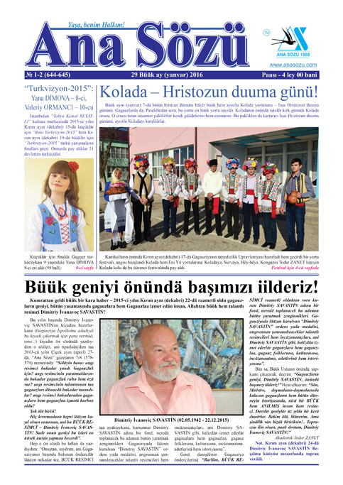 Zakonun 21-ci yılı kutlandı”, “İnsannar kaar esirliindä çıldırardılar”, “Sakatkara Türkiyedän koläska hem makak”, “Referendumnan ilgili Ţivil forumu olacek”, “Şkolalarda hem uşak başçalarında ilk yardım proektı”, “2015 “Yılın jurnalistı”, “Avdarmanın istoriyası için ikinci kiyat çıktı”, “Kolada hem Eni Yıl yortularına üürenci festivali”, “Balkan yazıcılar birlii Dernää kuruldu”, “Komrat çiftiçilär kalkıntısın 110-cu yıldönümü”, “Pötr YANULOV 2015-ci yılın en islää güreşçisi” h.t.b.
