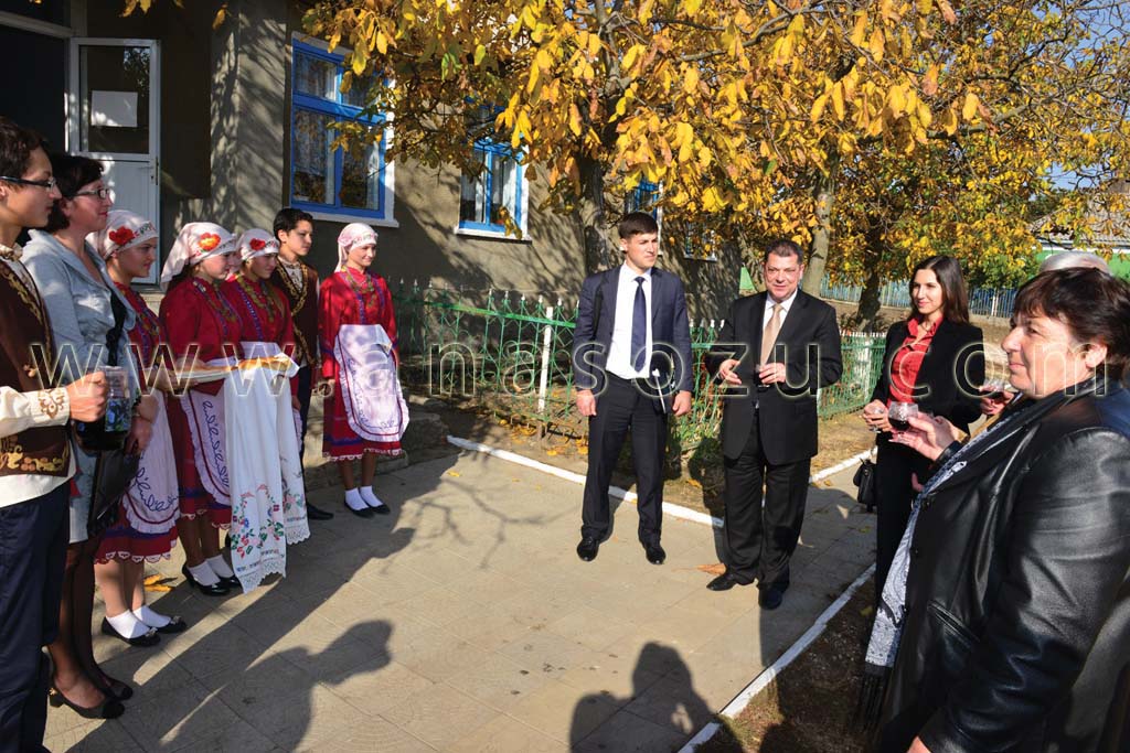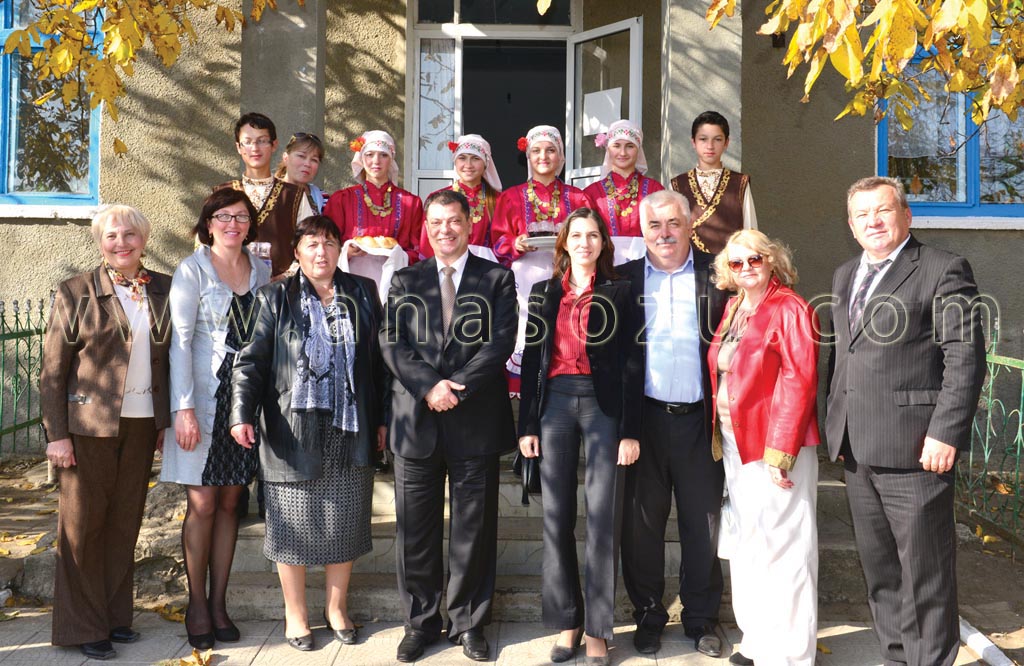 Baurçu küüyündä paalı musaafirleri tuz-ekmeklän karşladılar küüyün primarı Natalya KARAPİRÄ, gagauz dilindä üüredici Nina PAMUCAK, uşaklar hem küülülär.
