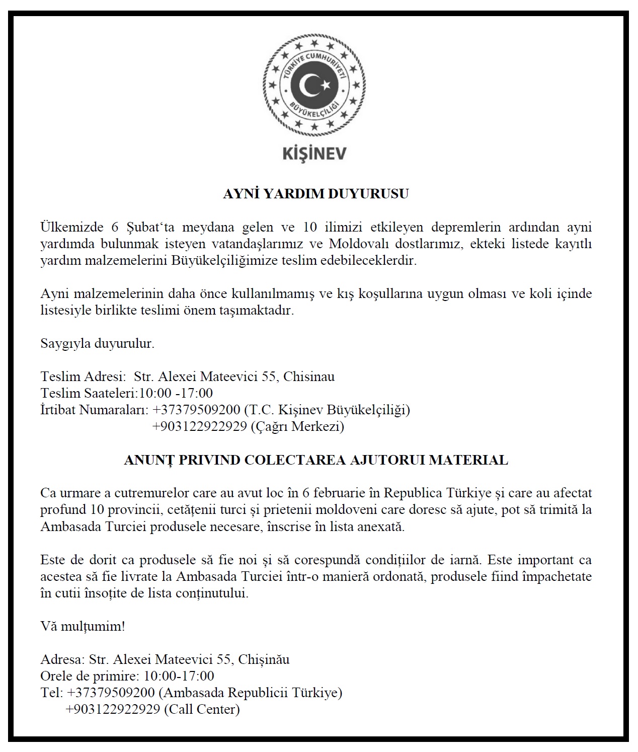 Türkiye Kişinev Büükelçilii açıkladı, ani büündän beeri kableder vatandaşlardan Türkiyedä er tepremesindän zarar görennerä deyni kış giyimneri iyecek yardımnarını.